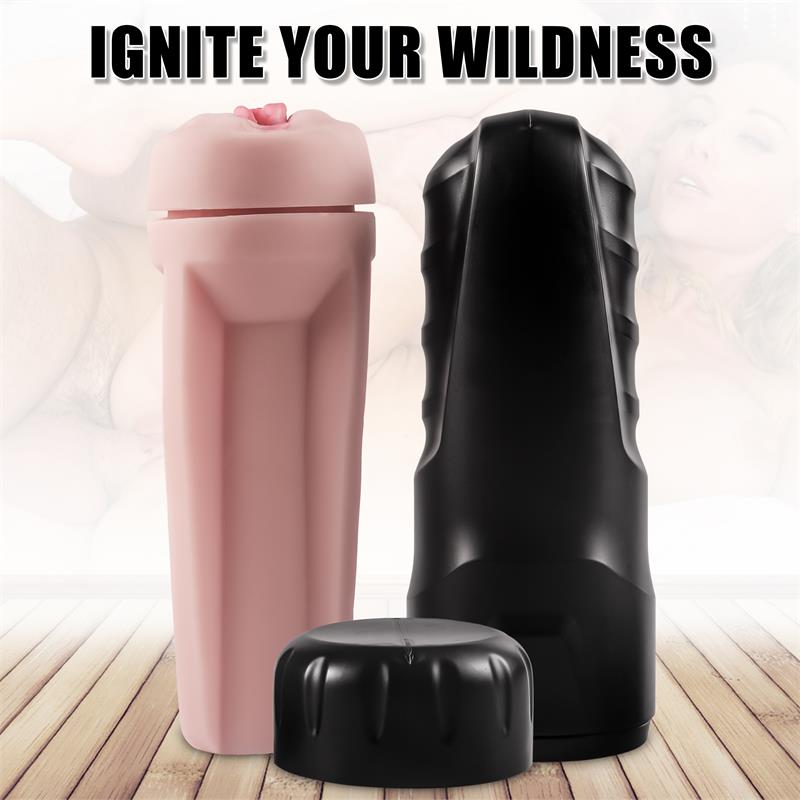 Masturbador masculino manual sencillo y práctico. Cuenta con una abertura en forma de vagina con un estuche de color negro con tapa.