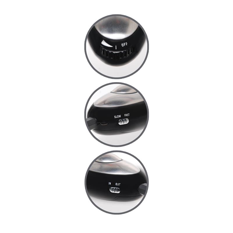 La unidad de control compacta Luv Touch envía impulsos eléctricos a las pinzas y pueden usarse solo como un masajeador manual o junto con las pinzas. Para usar el control como un masajeador manual, cambia al modo «IN». La pieza central ovalada brinda el impacto una vez que tu palma toca cualquier otra parte del metal. Para usar la unidad de potencia con las pinzas, pónla en el modo «OUT» y conecta la clavija de conexión de la pinza.